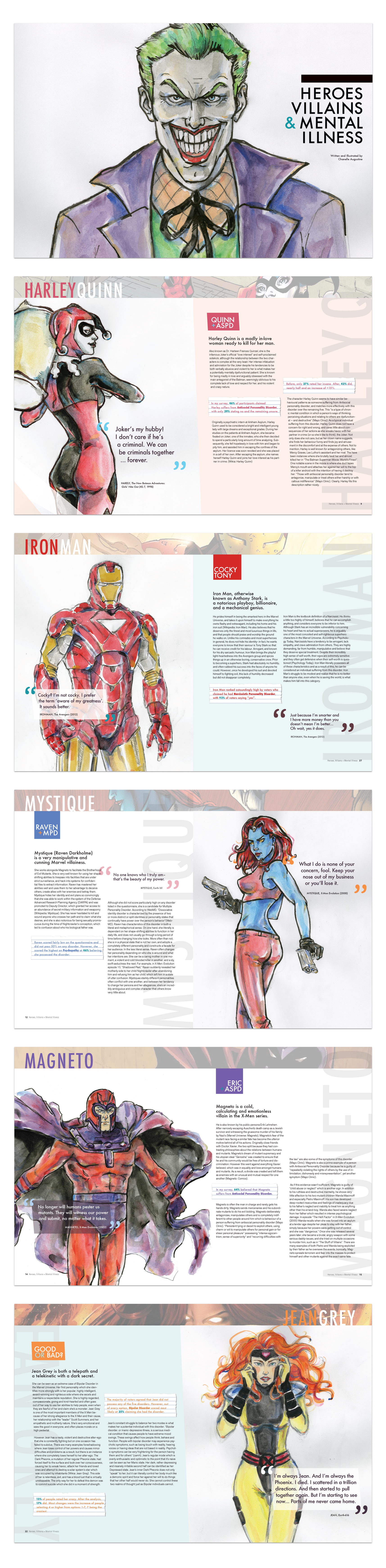 This illustrated book compares popular heroes and villains to common mental illnesses. I show the importance of mental health and indicate how common these disorders are. The purpose was to remove the stigma surrounding mental health issues, and present the symptoms of these illnesses in a playful and easily understood format. This book highlights the “flaws” in some of our favourite heroes and villains, and challenges the assumption that the ones with issues are always the bad guys.